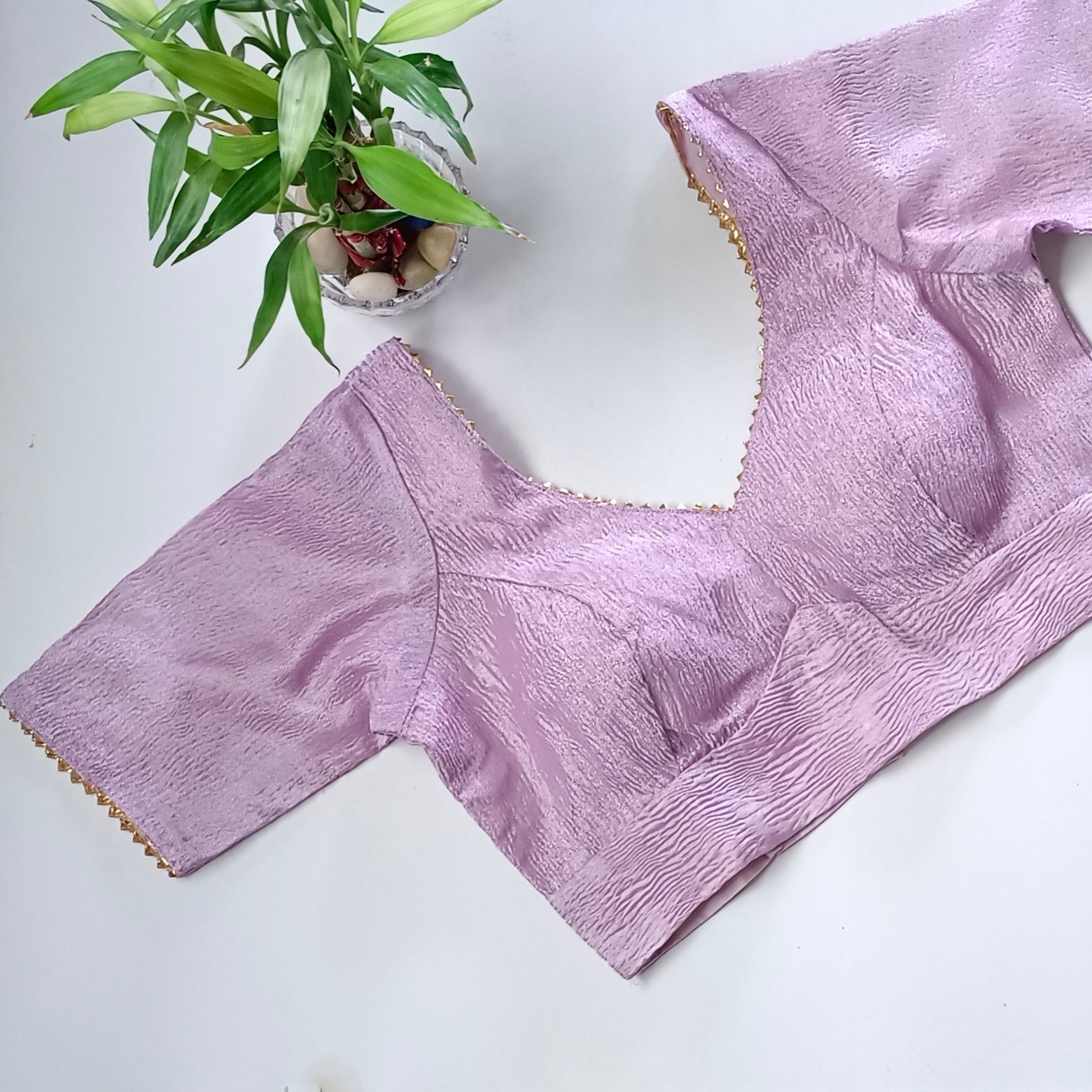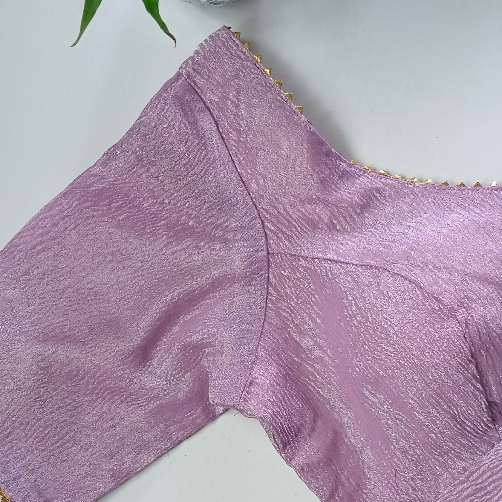 Metallic Lilac/light purple crush tissue blouse with gota patti lace , Curved V Neck