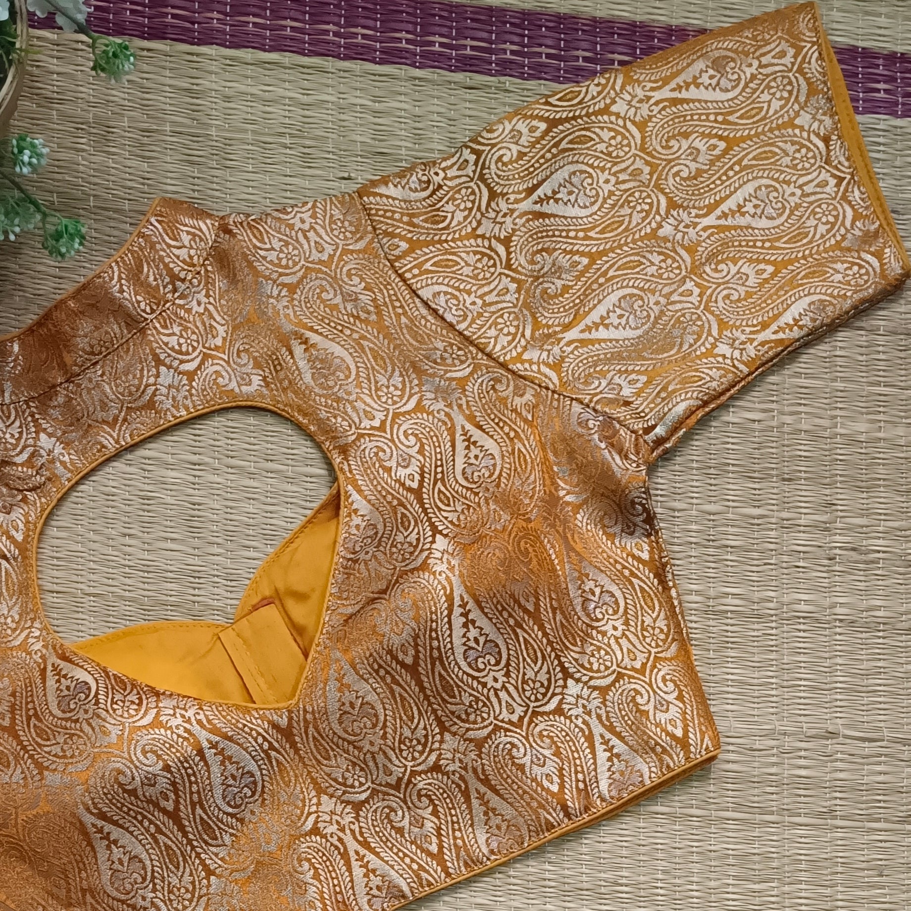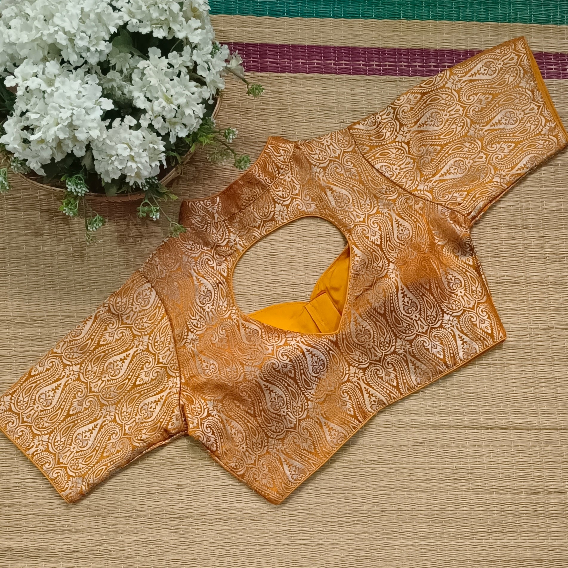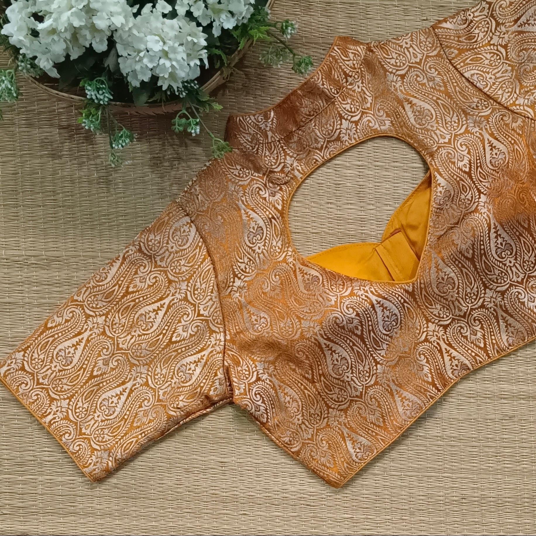 Mustard Yellow High Neck Brocade Blouse