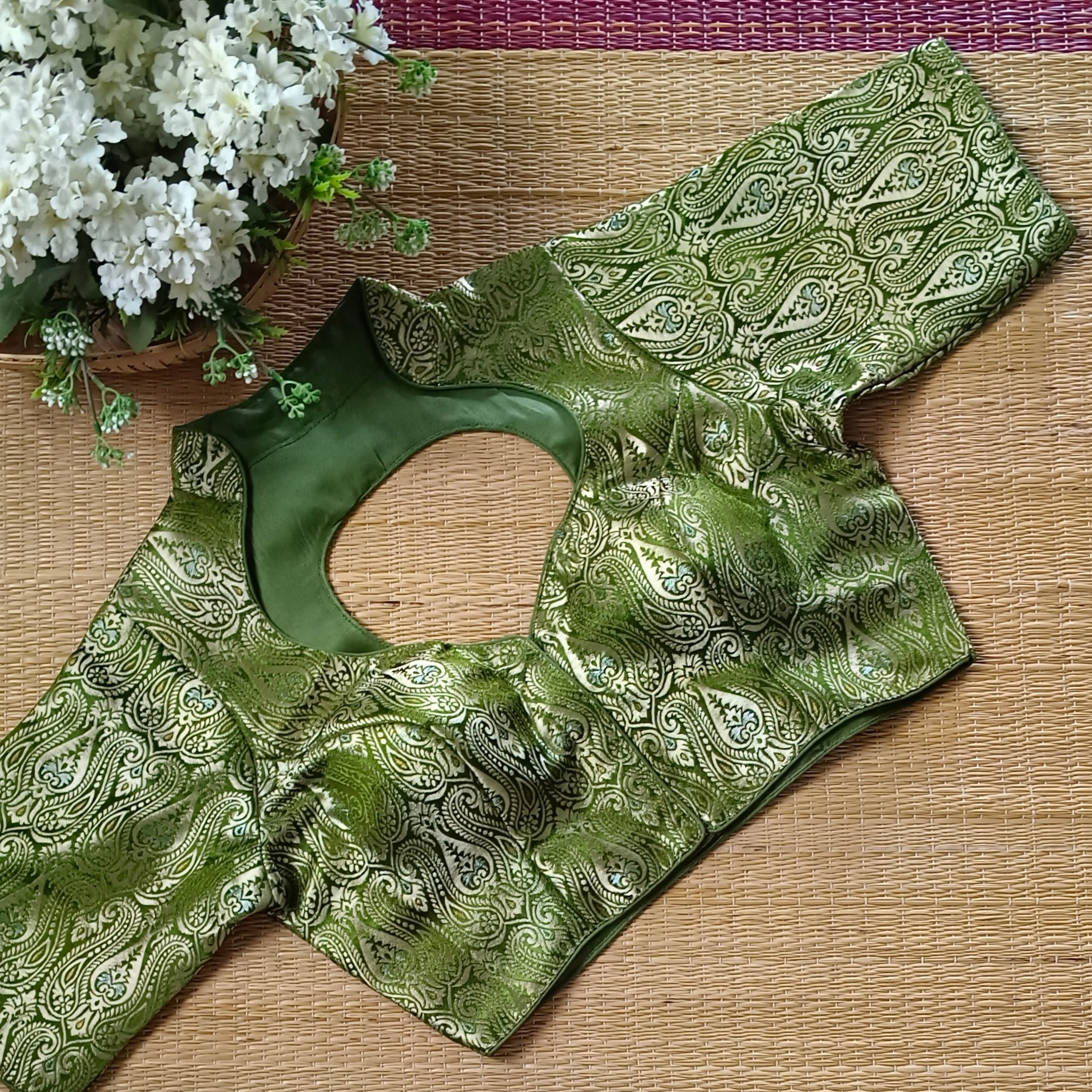 Olive Green High Neck Brocade Blouse