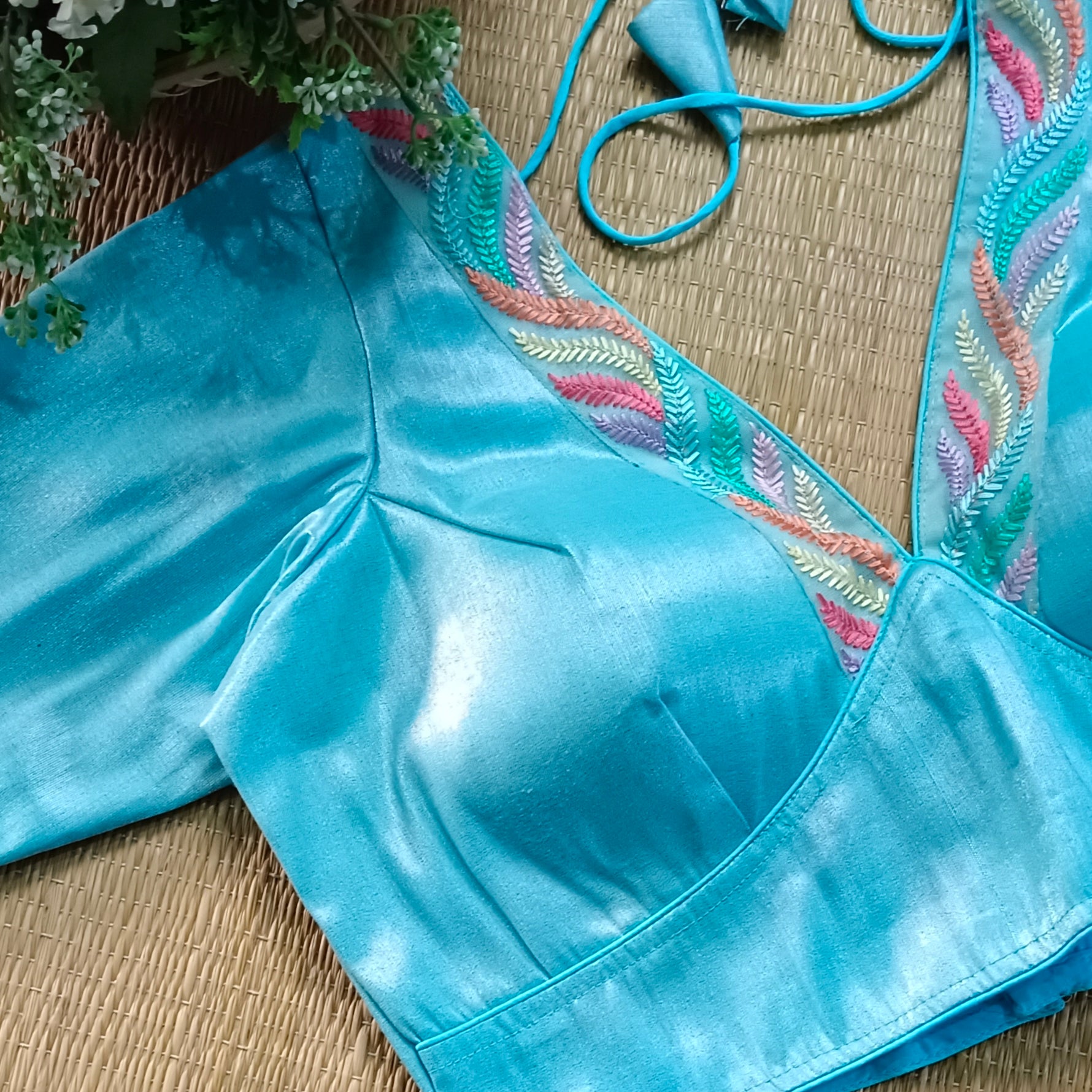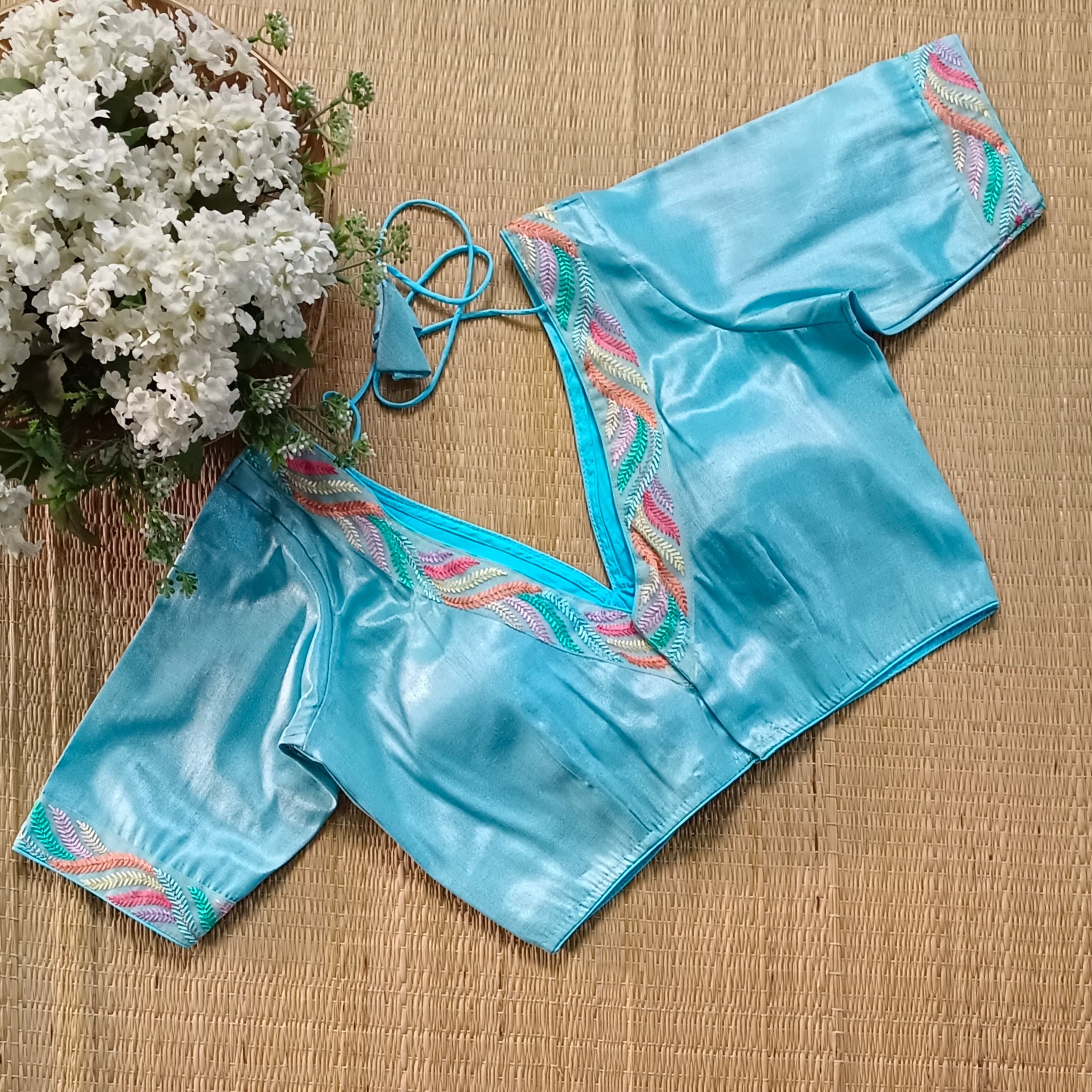 Pastel blue tissue blouse with multicolor embroidery, V Neck
