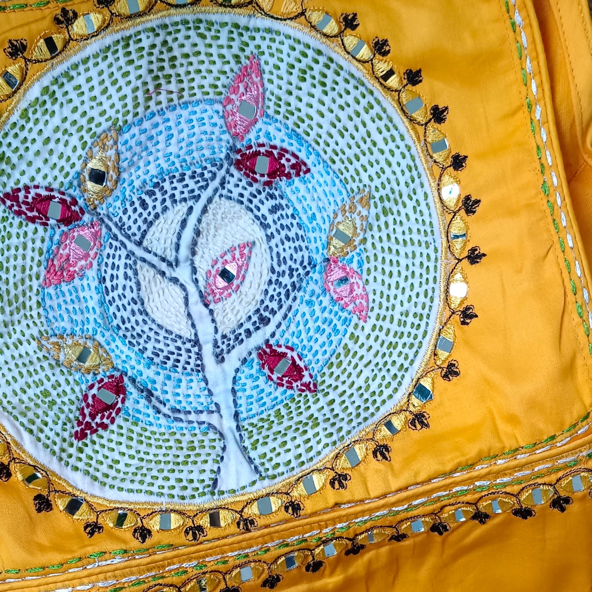 Yellow satin silk Blouse with Hand katha, mirror and applique work blouse,